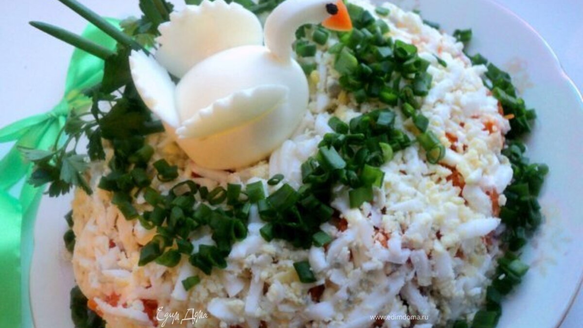 Украшаем салат мелко порезанным зеленым луком, листиками петрушки, по центру устанавливаем лебедя. Даем салату немного настояться и подаем на стол.
