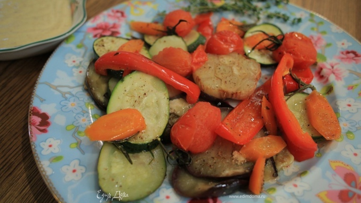 Выложить запеченные овощи на блюдо и подавать с соусом.