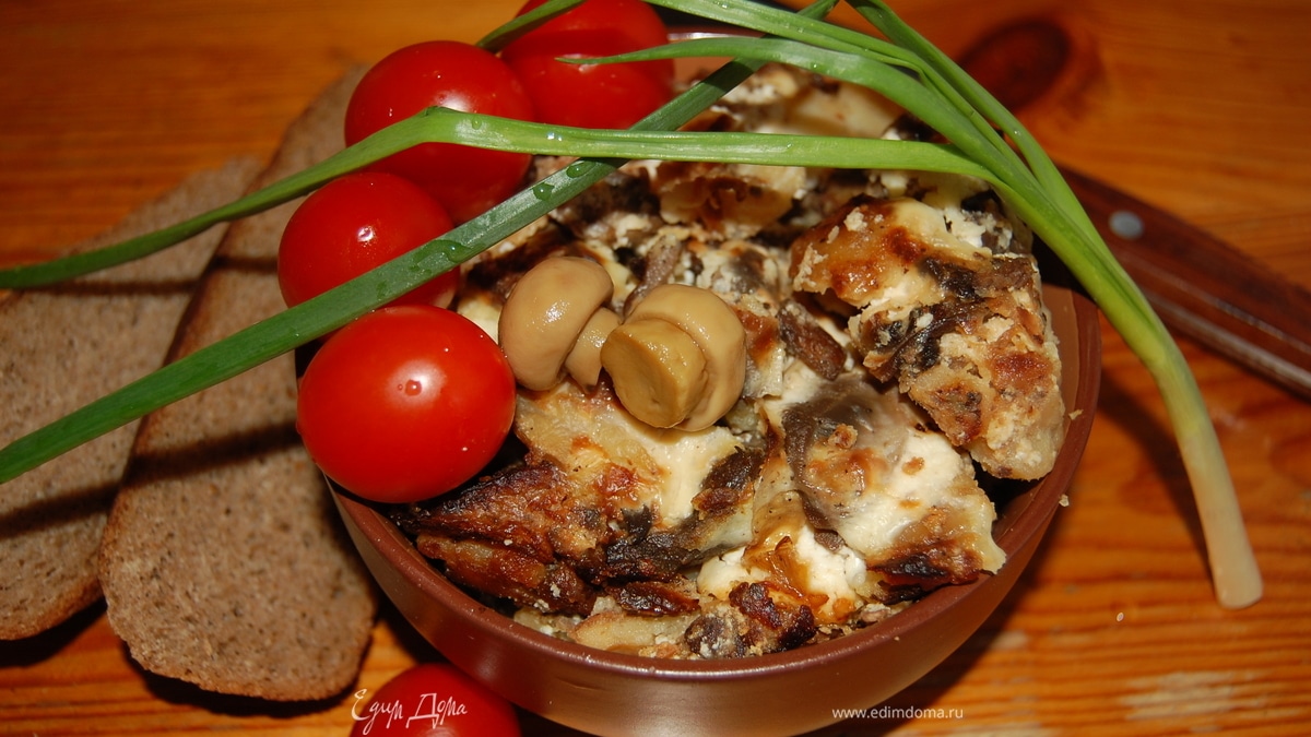 Картофель по-деревенски, запеченный с печенью, грибами, луком и сметаной