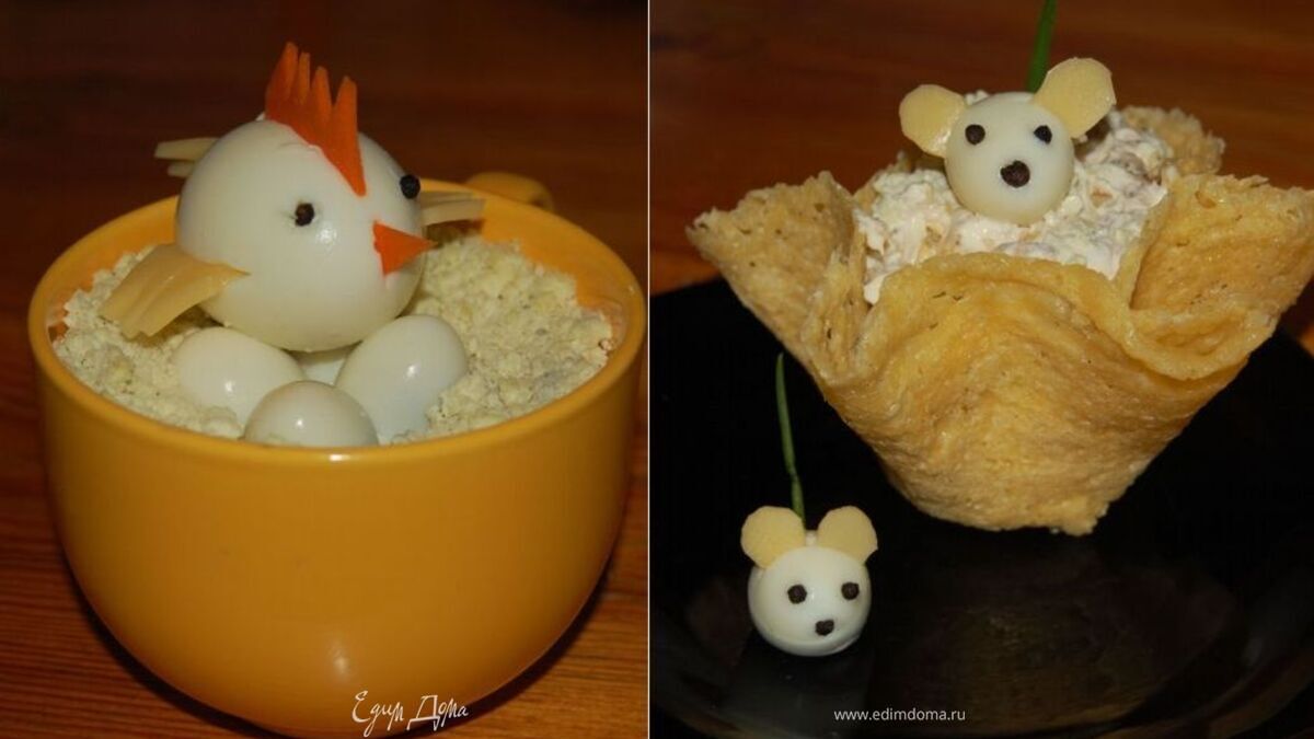 В каждой семье есть свой вариант приготовления этого салата. У нас вот такой. Украшения в виде мышат и курочка, а так же сырную корзинку я научилась делать в интернете. Мышата из перепелиных яиц, немного подрезала низ яичка для устройчивости. Ушки из сыра, глазки и носик из горошин чёрного перца. Хвостик из пёрышка зелёного лука. Курочка, которая сидит на перепелинных яйцах, из куриного яйца. Крылья и хвостик из сыра. Гребешок и клювик из сырой моркови. Глазки-горошины чёрного перца. А сырную корзинку делала так: Твёрдый сыр настрогать на тёрке длинными палочками. Сковороду с антипригарным покрытием смазать растительным маслом и хорошо разогреть. Равномерно насыпать сыр (на большую корзинку 2 столовые ложки) на горячую сковороду и жарить, пока сыр не станет достаточно твёрдым, чтобы снять его лопаточкой. Снимаем, быстро надеваем на перевёрнутую рюмку или стакан, прижимаем салфеткой края, чтобы придать форму вазочки. Как застынет, можно снять.