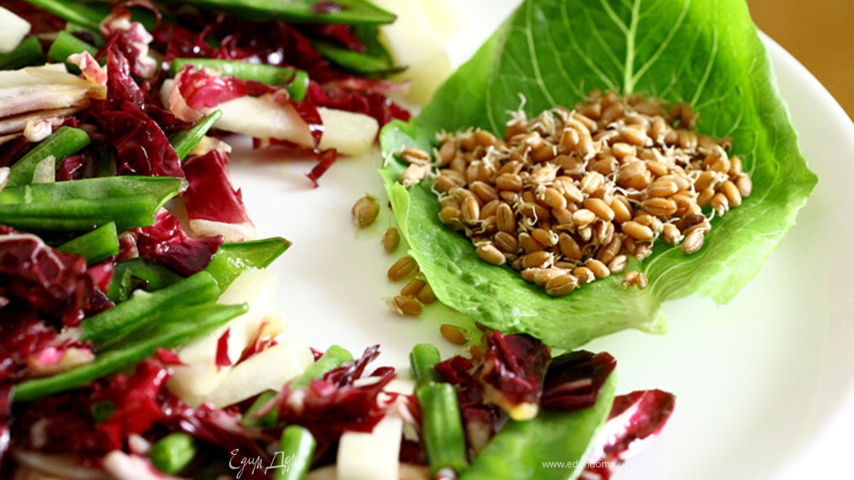 На тарелку на лист щавеля или салата выкладываем пророщенные зерна пшеницы.
