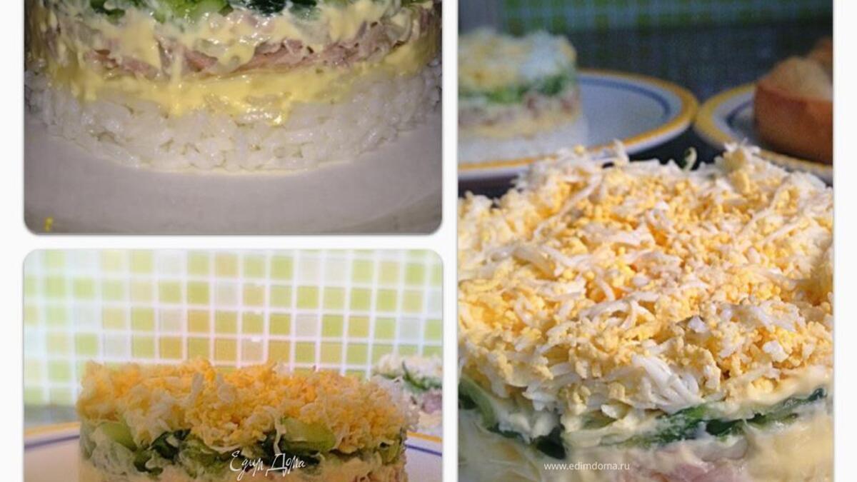 - Шаг 3Все укладываем слоями: рис, сыр, тунец с луком, огурец, яйцо, промазывая тонким слоем майонеза. Приятного аппетита!