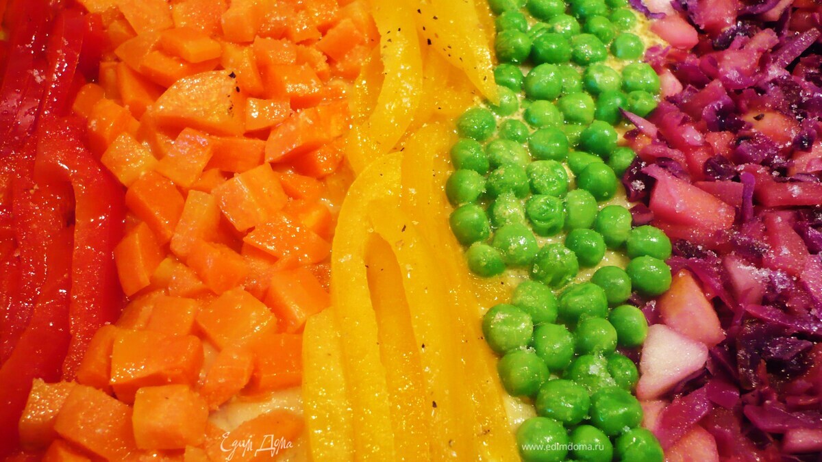 Достаем из духовки. Посыпаем оставшимся сыром и ставим в духовку еще на пять минут. Достаем из духовки, включаем режим Гриля. На запеканку поочередно вдоль выкладываем овощи, сначала красный перец (образовавшуюся при маринаде жидкость нужно слить, перец немного обтереть бумажным полотенцем, также поступить с горошком). Затем полоску моркови, потом желтый перец, затем горошек и капусту. Посыпаем сверху слегка сахаром и ставим под гриль на 5 минут. Приятного аппетита!!!