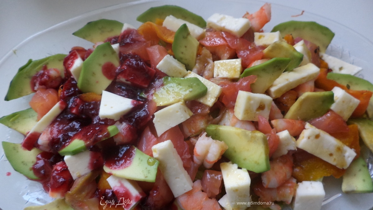 Листья салата уложить на дно тарелки,затем пластинки тыквы,на них рыбу и креветки и т.к. листьев салата было мало,я решила добавить зелененького с помощью авокадо,нарезать тонкими пластинками и уложить, также кубиками порезать брынзу или сыр,с тем учетом что рыбка соленая я брала только внутреннюю пресную часть брынзы,сверху посыпать орешками и полить соусом!!