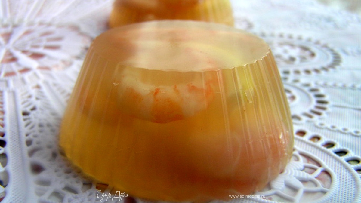 Шампанское нагреть до полного растворения желатина, добавить креветочный бульон, сахар, перемешать, досолить по вкусу, залить в формочки до середины. Убрать в морозилку на 5-7 минут, чтобы верх схватился. - Шаг 4