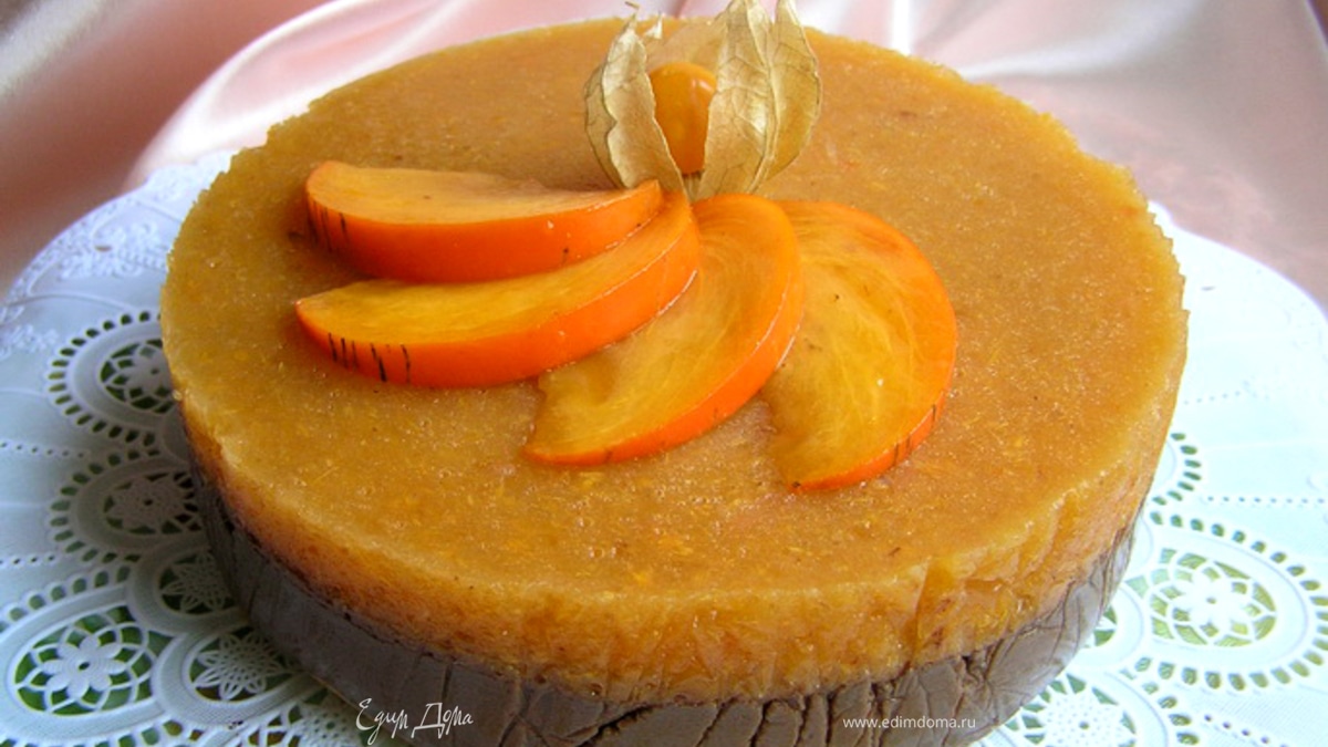 Застывший торт аккуратно вынуть из формы, украсить хурмой и физалисом.