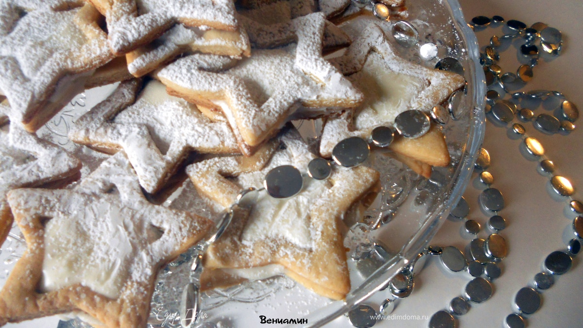 - Шаг 1Раскатать толщиной примерно 0,5-0,7 мл., вырезать выемками звезды (две выемки разного размера), выложить на противень, застеленный бумагой для выпечки. Выпекать в заранее разогретой до 170-175 С духовке, около 8-9 минут (не должны потемнеть, должны оставаться светлыми и немного мягкими). Остудить. Для крема соединить все ингредиенты, собрать печенье, смазывая получившимся кремом. При подаче присыпать сахарной пудрой (через сито).