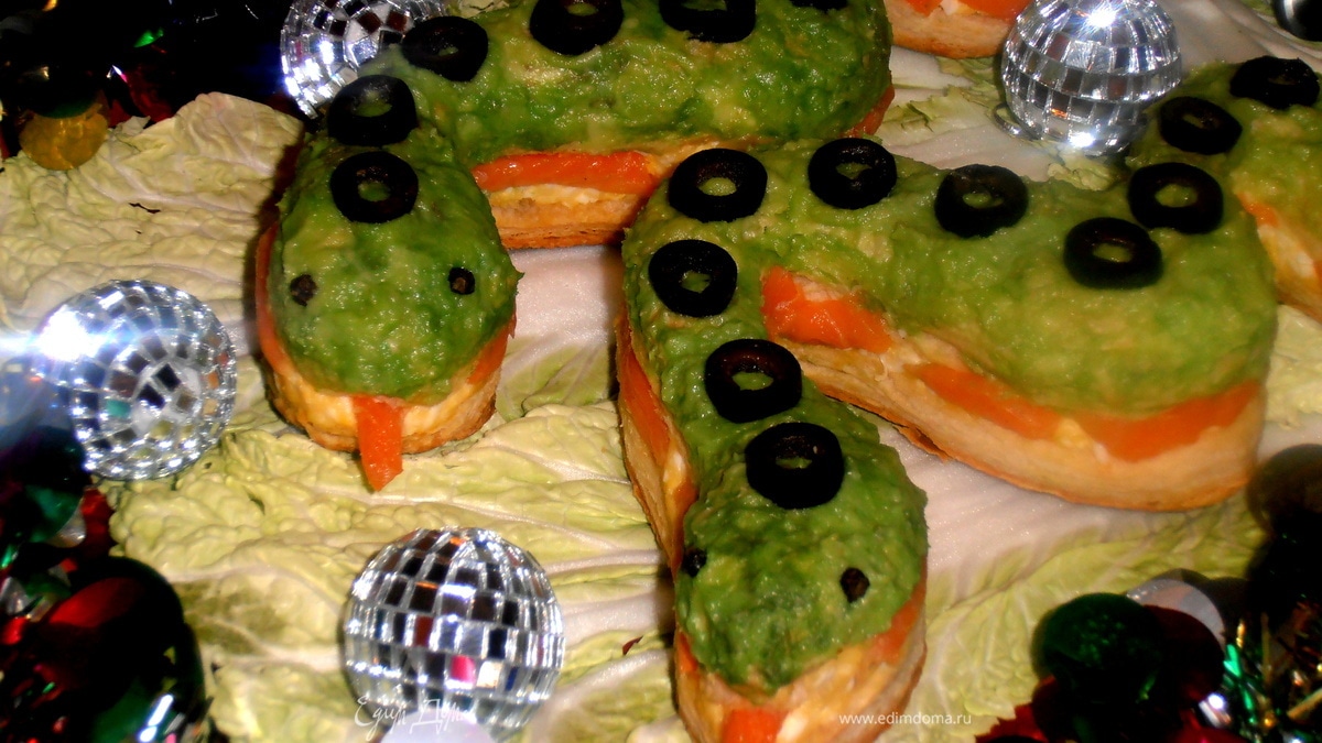Участник конкурса "Угощаем с "Деликатеской". Идея блюда со "змеиной" тематикой витала все дни в воздухе... Но салатов везде - море, а хотелось пооригинальничать! Слоёное тесто из морозилки подсказало сделать основу, а сырный салатик внутри всем знаком))) Оформление - самое увлекательное в этой закуске!