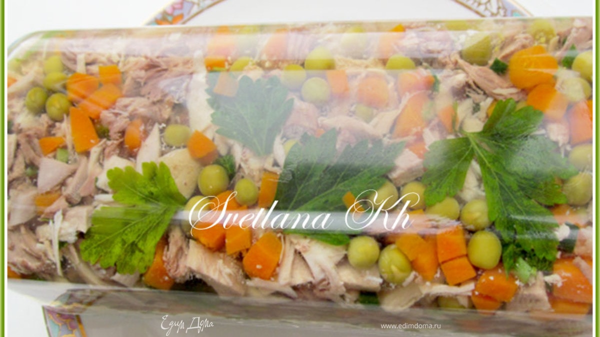 Это еще один вариант праздничного заливного, в виде такого плотного террина, который нарезается, как холодец. Так как, я готовила заливное из языка и мяса, то в террин вошло это же мясо, плюс курица и овощи. Рецепт приготовления заливного очень здорово описан Леночкой -ссылка на рецепт Я готовила по ее рецепту, но со своими изменениями и добавлениями. К сожалению, не смогла делать пошаговые фото, так как, было очень поздно и темно.