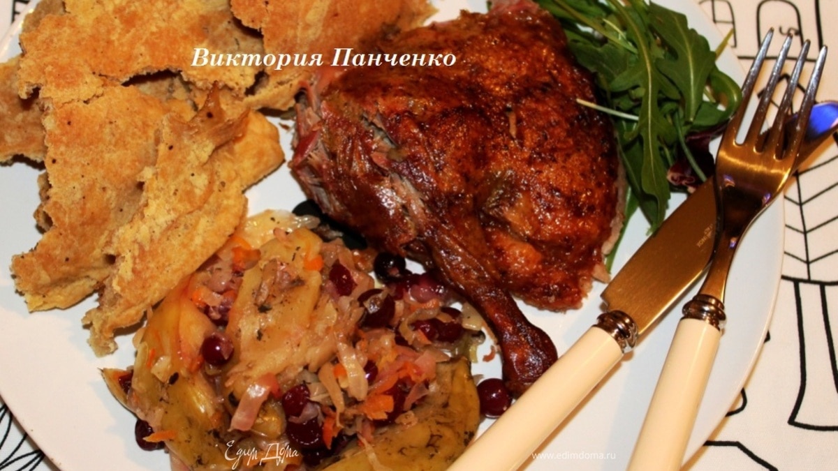 Такую утку я запекаю на Новый год уже несколько лет подряд...И она нам не надоедает)))))))))))))) Единственное, что не повторяется из года в год, это - начинка. В этом году я фаршировала утку квашеной капустой, клюквой и зелеными яблоками.