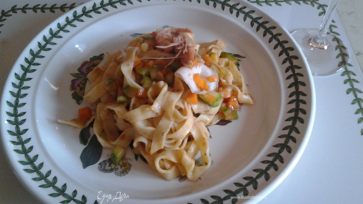 Домашние тальятелле с креветками, мини-кальмарами и овощами