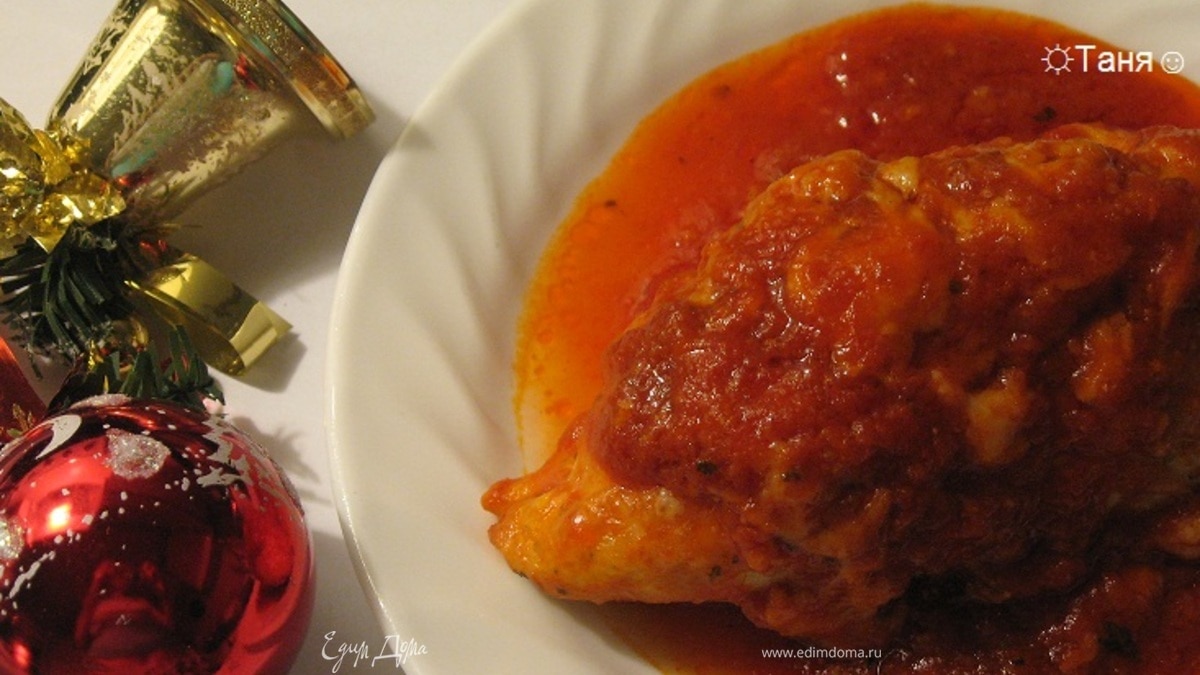 В посуду в которую мы будем выпекать курочку, положить пол стакана соуса маринара, на соус выложить курочку. - Шаг 3