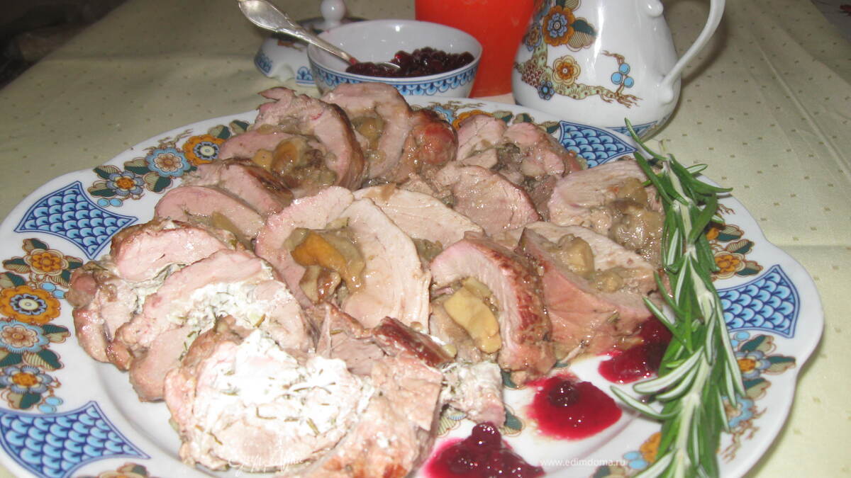Подавать рулеты, порезав, в горячем виде, украсив подогретое блюдо веточкой розмарина, кляксами клюквенного соуса, сбрызнув бульоном с противня. В соусниках подать горячий бульон с противня, а также клюквенный соус. - Шаг 12