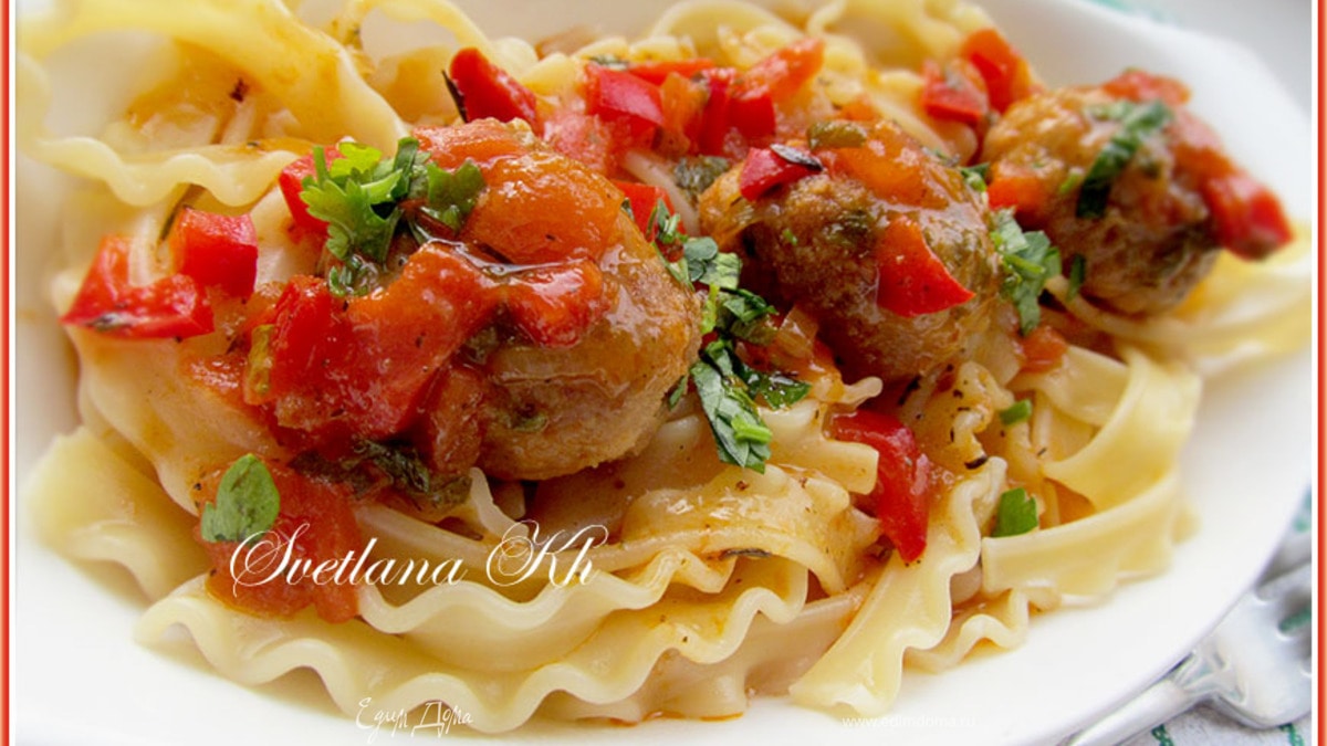 Тефтельки с пастой мафальдине в пикантном соусе