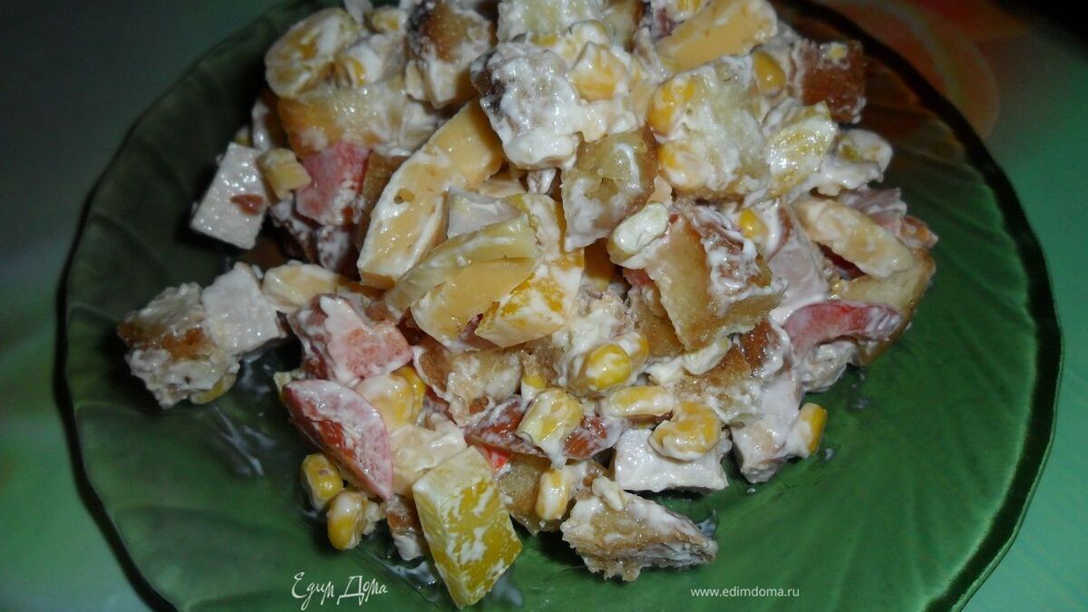 Все это соединяем с кукурузой и сухариками. Добавляем майонез и перемешиваем. Салат готов, всем приятного аппетита и хорошего настроения.