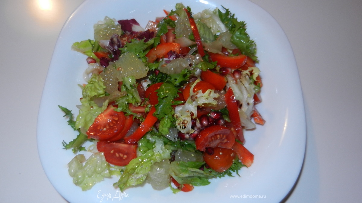 - ПодготовкаПомидоры нарезать на четвертинки, салат немножко порвать, свити очистить от перепонок, мякоть разделить на кусочки примерно 1,5*1,5 см, перец нарезать тонкими полосками примерно по 5 см, добавить гранат, всё перемешать, заправить салат соусом. Для соуса: выдавить в чашку сок 1 лайма, добавить ст. ложку оливкового масла, 1/2 чайн. ложки соевогой соуса, щепотку смеси перцев, 1 чайн. ложку французской горчицы, всё хорошенько перемешать,
