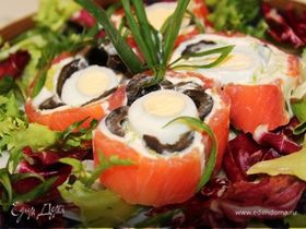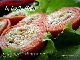 - Шаг 3Приступаем с скручиванию роллов. На циновку кладем 1/2 листа нори и, отступив от себя 2 см, выкладываем рис (руки каждый раз перед тем как взять порцию риса смачиваем в воде). Стараемся выкладывать рис, заходя за пределы листа нори см на 2. Переворачиваем. Выкладываем сначала сыр, потом авокадо и рыбу и начинаем аккуратно сворачивать ролл. Когда ролл будет свернут, покрываем его икрой летучей рыбы. Разрезаем на 8 частей и подаем. Приятного аппетита!