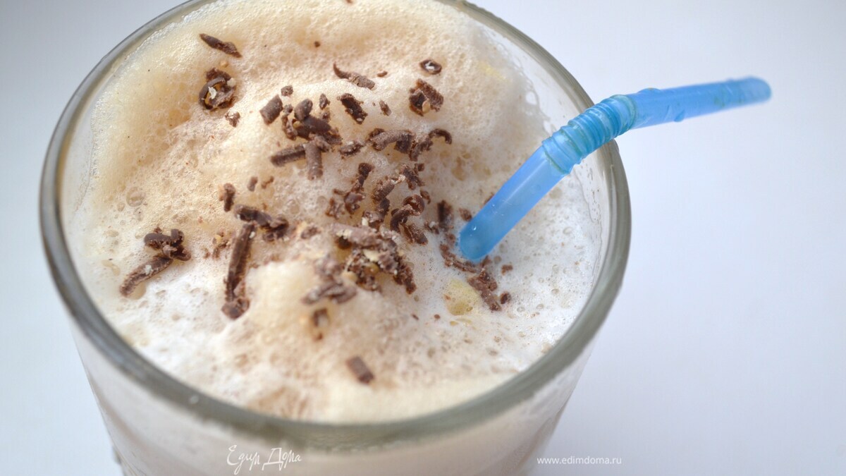 Тонкой струйкой влить оставшуюся холодную воду и сливки. Аккуратно добавить 2 кубика льда. Посыпать шоколадом и орехами. Подавать с соломинкой.