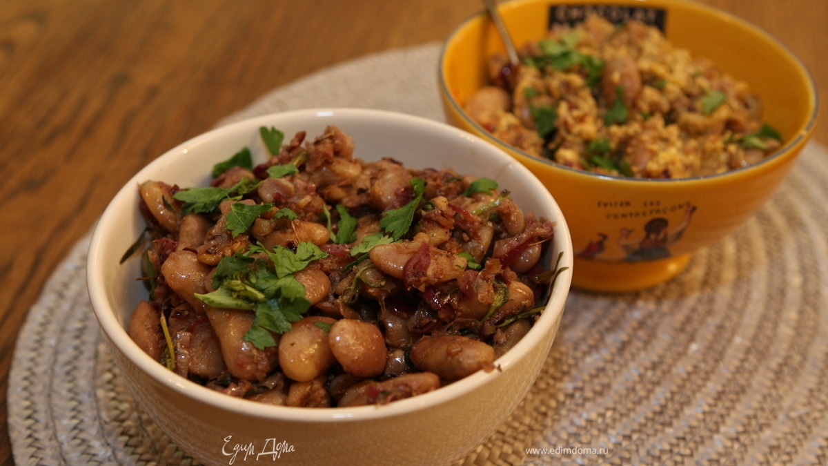 Добавить в фасоль орехи с чесноком, уксус с тархуном, кинзу и базилик, черный перец с кориандром, листья сухого тимьяна и сунели. - Шаг 11