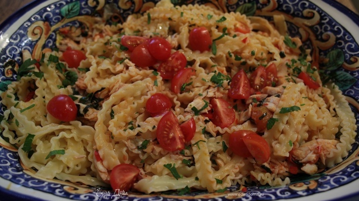 Переложить пасту с рыбой на блюдо, украсить помидорами черри, посыпать петрушкой и сбрызнуть оставшимся оливковым маслом.