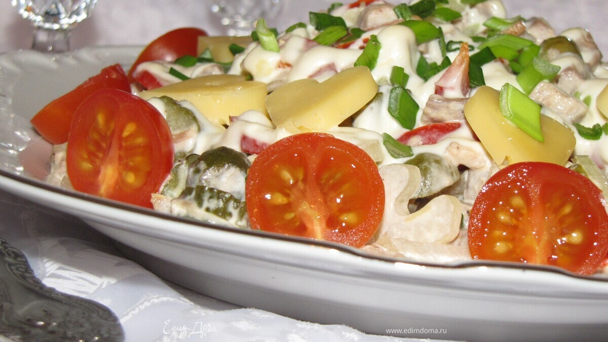 На порционную тарелку, выложить салатные листья (у меня не было). На листья выложить охлажденный салат. Посыпать тертым сыром (я не посыпала, а украсила сердечками из сыра), по краю тарелки выложить помидоры черри, разрезанные на половинки. Полить салат оставшейся заправкой. Приятного аппетита!