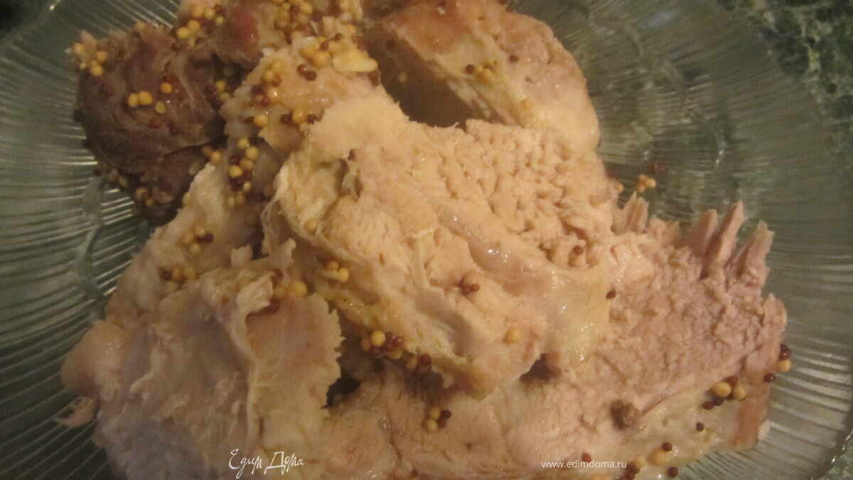 Мясо натереть солью, специями и зерновой горчицей. Проткнуть мясо в нескольких местах.