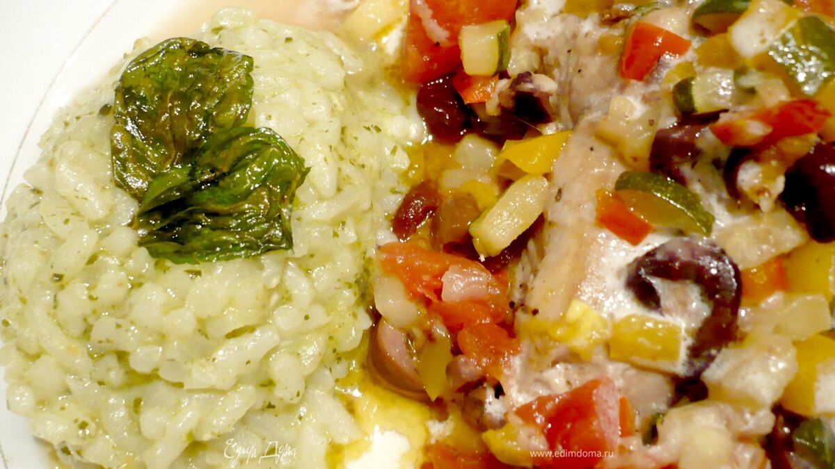 Филе сома под овощным гратеном на ризотто с песто