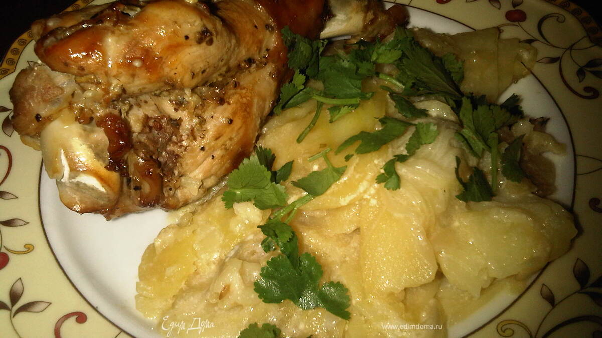 - Шаг 3Картофель и лук равномерно перемешать со сметаной (майонезом) и остатками маринада, добавить соль, свжемолотый перец и тмин (я перемешиваю уже в рукаве). Переложить картофель с луком в рукав, туда же прячем поджаренные крылья. Рукав закрываем, убираем его на противень и отправляем в духовку на 40-50 минут. Через 20-25 минут я переворачиваю рукав, чтобы картофель не пригорал.