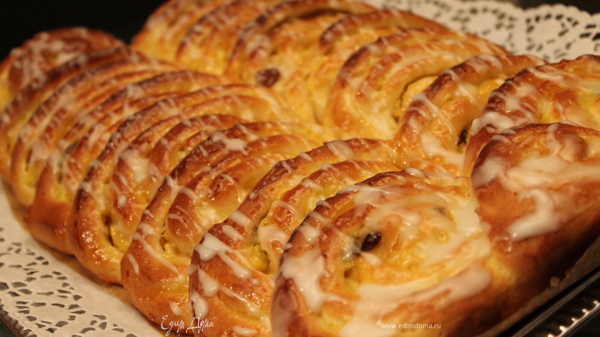Замешиваем тесто обычным способом. ставим для расстойки в теплое место. примерно на 2,5 часа. Варим пока пудинг. берем 750 мл. молока добавляем сахар, 2 уп. пудинга. и варим на медленом огне до загустения. В готовый добавляем изюм и накрываем пленкой чтобы не образовалас корочка,даем остыть ему. Подошедшее тесто раскатываем в пласт 40 на 60см. кладем нашу начинку и размазываем, скручиваем тесто с начинкой в колбаску. режем ее на шайбы по 1,5см. Эти шайбы укладываем на лист внахлест, друг на друга. даем постоять в тепле 40минут. - Шаг 1