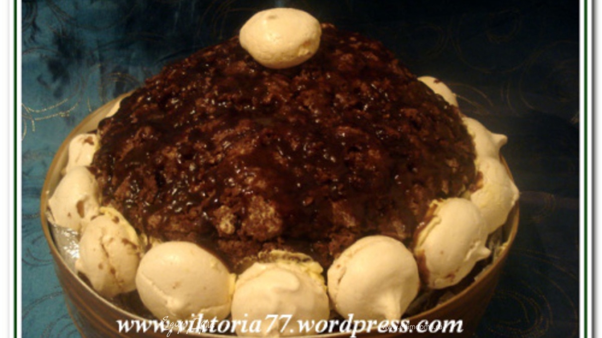 Один корж сбрызнуть сиропом и намазать кремом. Выложить слоем безе и накрыть вторым коржом, который также сбрызнуть сиропом и промазать кремом. Оставшийся корж порезать кусочками, сбрызнуть сиропом, добавить крем и хорошо перемешать. Выложить приготовленную массу куполом. Оставшиеся безе смазать кремом и прикрепить по кругу бисквита. Сверху торт полить помадкой. - Шаг 11