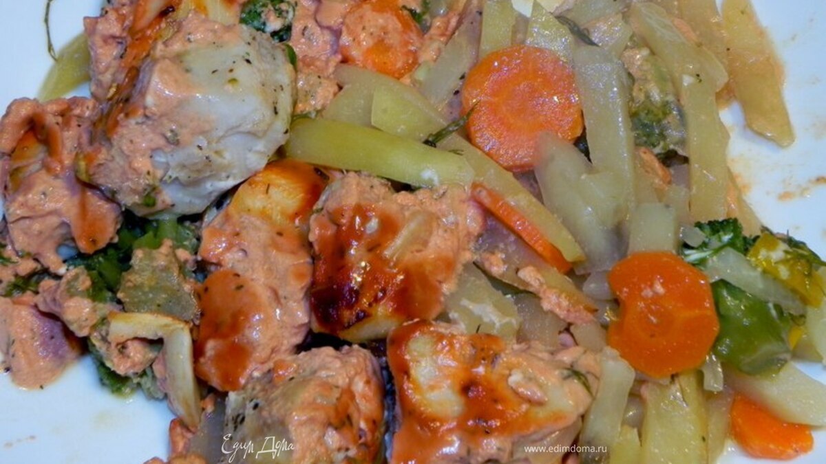 - Шаг 2В форму для запекания выложить овощи, добавить брокколи, укроп(я просто порвала его руками на маленькие веточки), посолить, поперчить, на овощи выложить рыбу и смазать соусом: сметана, томат.паста, чеснок, соль, перец, прованские травы. Запекать в разогретой духовке минут 40-45.