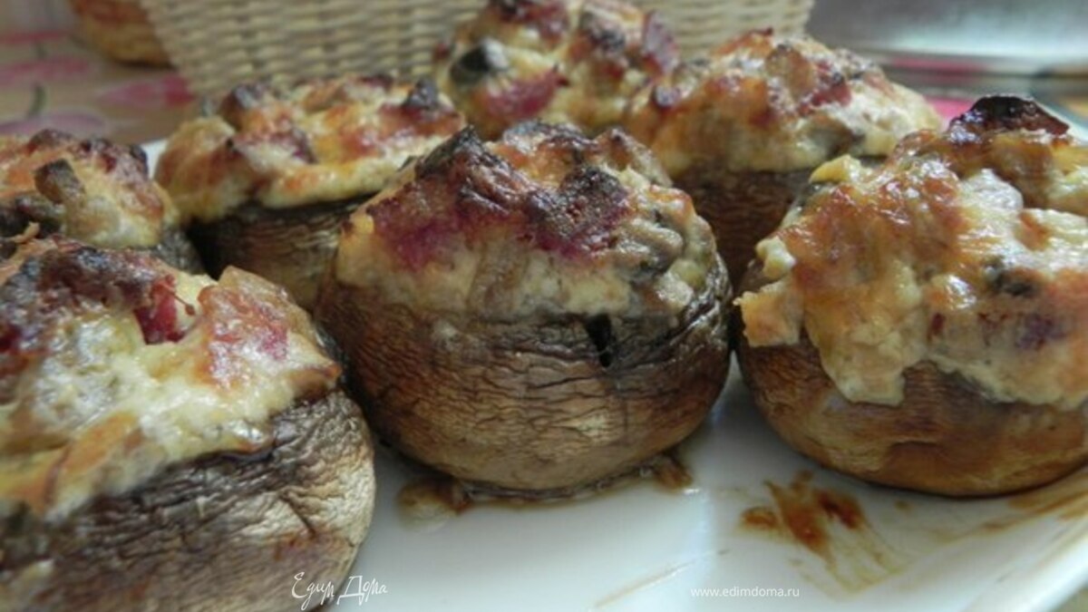 - Шаг 2Выложить в салатник. Добавить мелко порезанную ветчину, сыр. Заправить сметаной. Этим фаршем наполнить шляпки грибов. Запекать в духовке минут 20.