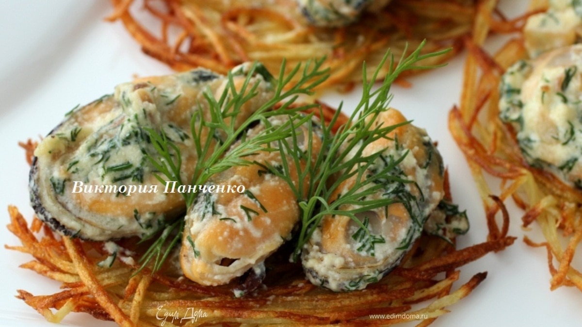 На картофельные лепешки выложить мидии, украсить укропом и подавать немедленно...