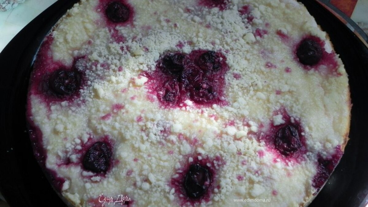 - Шаг 1Творог соединить с сахаром, яйцами и вишней. Выложить творожную массу в форму, сверху раскрошить остаток сыпучей массы и поставить в разогретую до 180 градусов духовку на 30 мин. Дать остыть, а затем вынуть из формы