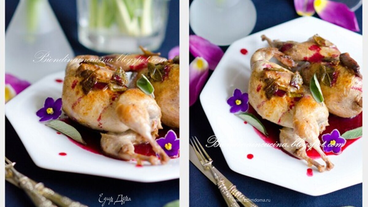 Перепелки с шалфеем и кули из малины,черники и фиалки