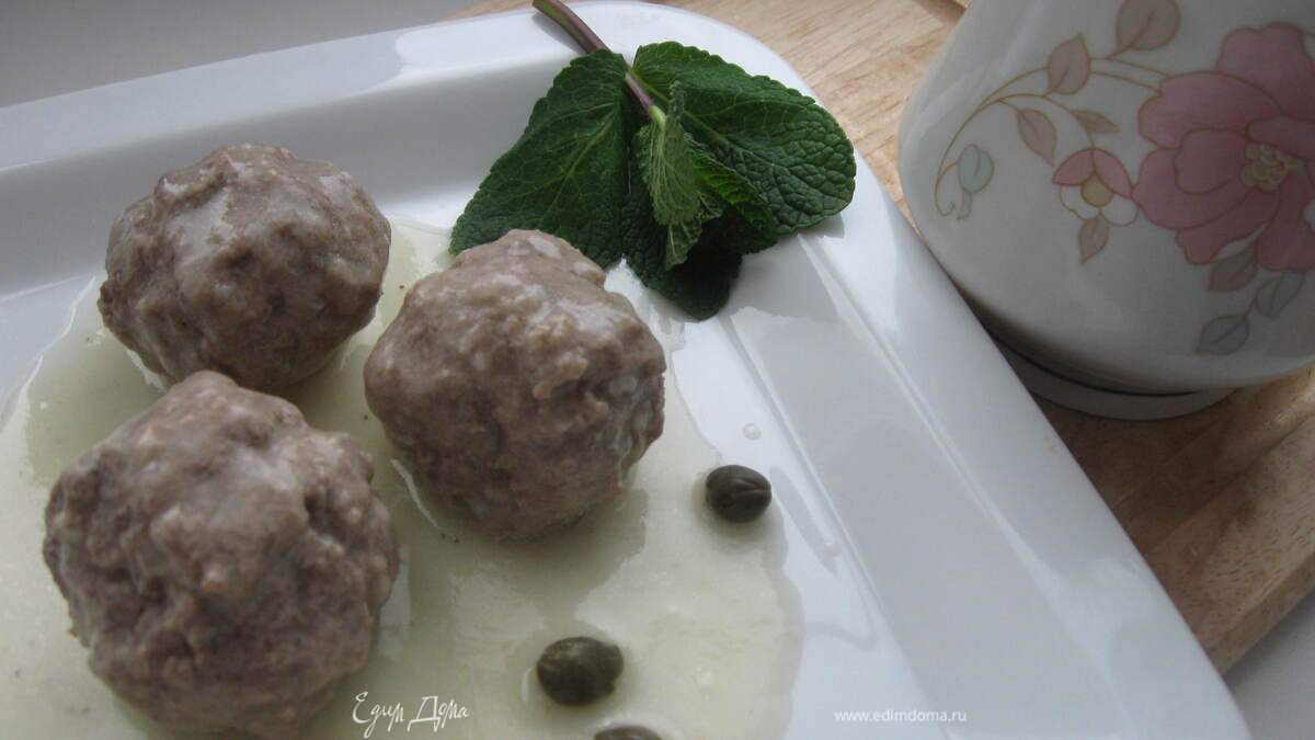 К маслу, перемешанному с мукой, добавляем 1 л бульона от клопсов, вино, каперсы, перец молотый, соль, сахар. Ставим на малый огонь, помешиваем, через 5 минут добавляем сок от половины лимона, еще ему даем потомиться 5 минут. Соус должен постоять 10 минут без огня. - Шаг 7