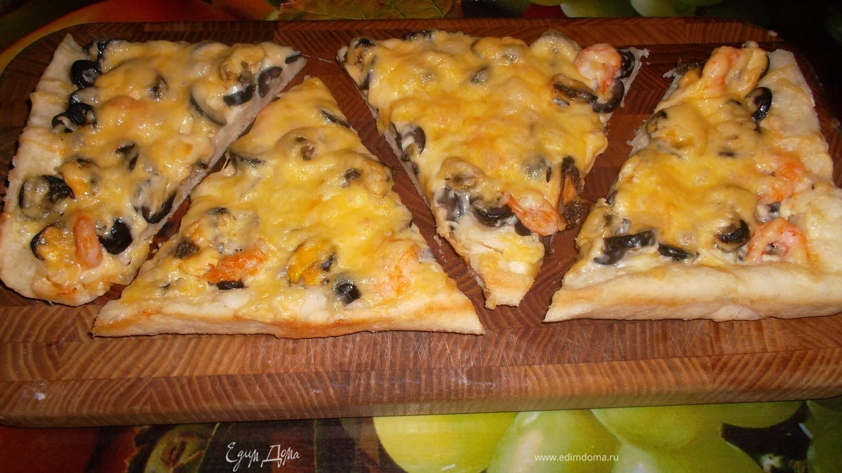 Кипятим воду. Креветки и мидии бросаем в кипяток и выключаем воду. Маслины нарезаем кружочками... - Шаг 2