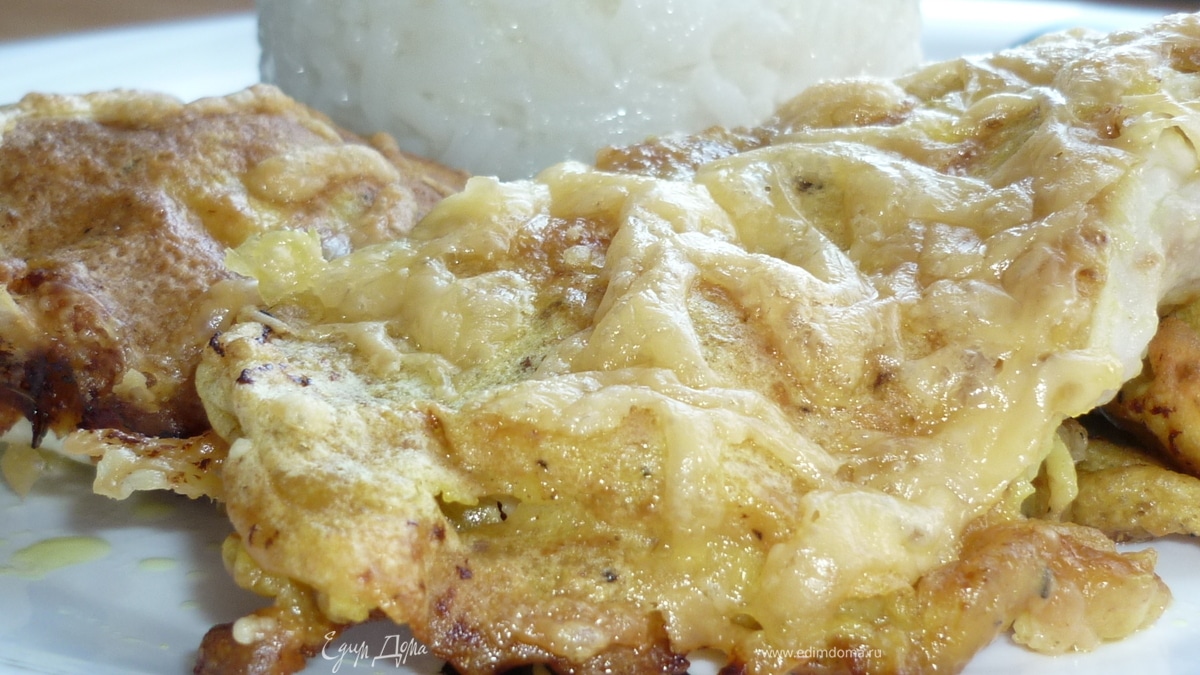 - Шаг 3Слегка отбейте курицу, обмакните в тесто для кляра и обжаривайте 6–7 минут. Можно посыпать готовую курицу в кляре тертым сыром и зеленью.