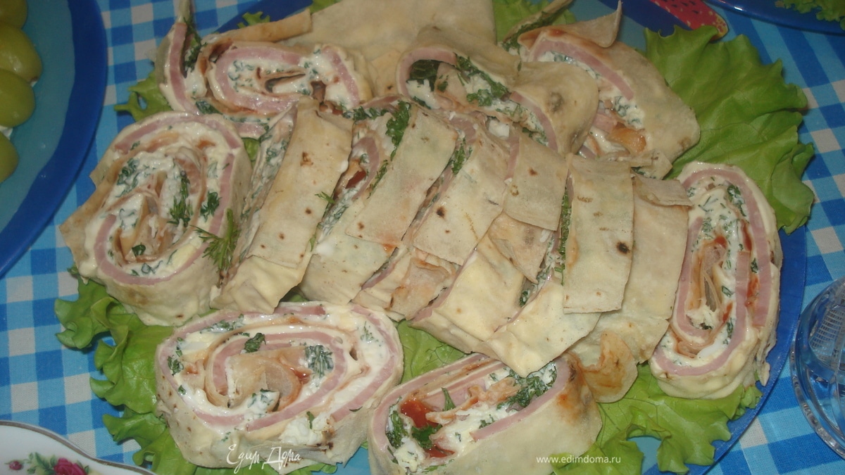- Шаг 1Разложите на столе 1 лист лаваша, смажьте всю поверхность плавленным сыром, выложите нарезанную тонкими ломтиками ветчину, посыпьте мелко нарубленной зеленью, тертыми на мелкой терке яйцами. Тонкой струйкой равномерно нанесите майонез, сверху положите второй лист лаваша, смажьте его кетчупом, сверните аккуратно в рулет, плотно оберните пленкой и уберите в холодильник на 2 часа. Затем разверните и нарежьте кусочками шириной 1,5 см. Выложите на большую тарелку, украшенную листьями салата.