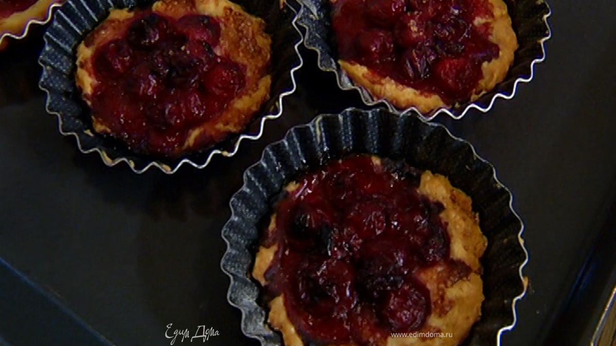 Охлажденное тесто распределить по формочкам для тарталеток, в центр выложить по нескольку ягод вишни и посыпать сахаром. - Шаг 7