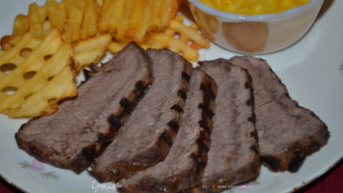 Достанем из холодильника перед готовкой за ранее на 1 час и дадим ему полежать при комн. тем-ре.Достанем из пакета, уберем с говядины лук и чеснок. Посолим 1 ч.л. солью и 1 ч.л. черным перцем. Выложим на гриль и готовим на сред.высоком огне для сред.прожарки 11 мин. сторона. У меня грильница электрическая. - Шаг 3