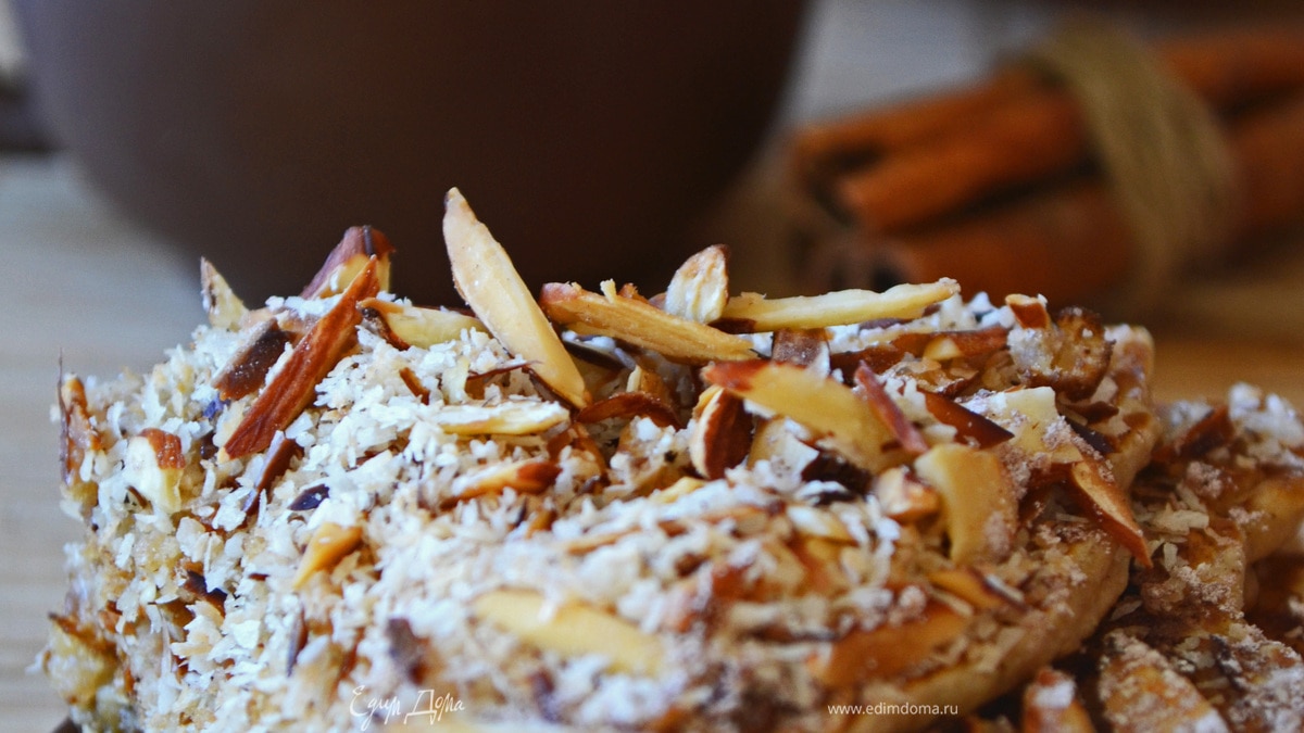 Яблочные панкейки с миндалем, лавандовым медом и кокосовой стружкой