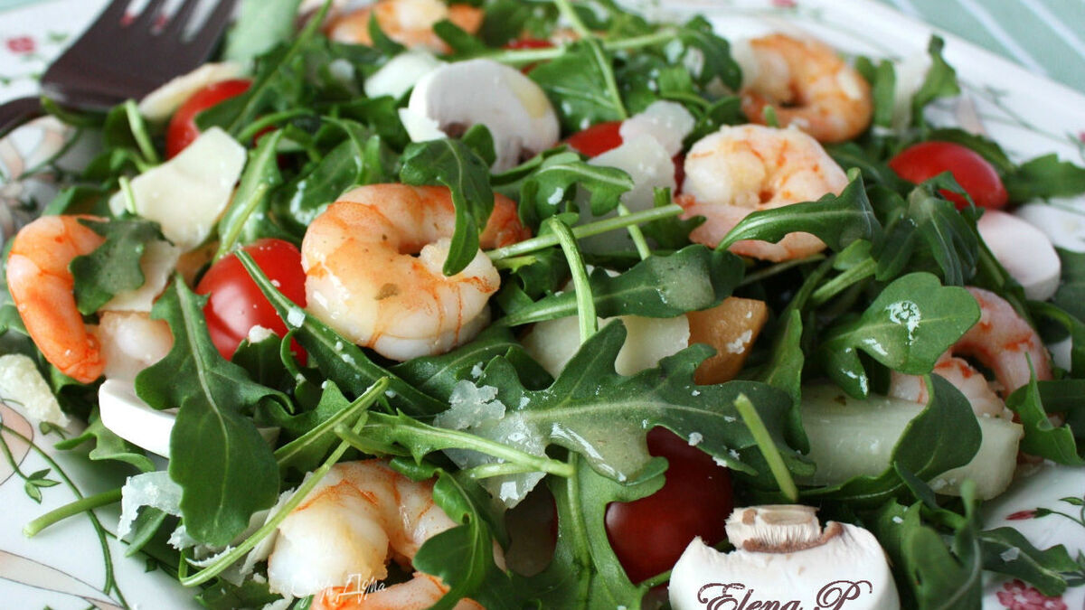 Обнаружила на сайте 6 страниц салатов с креветками: каких там только нет! Моего варианта там нет. Это один из моих самых любимых салатов! Раз в неделю непременно его готовлю. Легкий, полезный и вкусный, да и готовится быстро! Мне он вполне заменяет ужин. Я обязательно добавляю в него сырые шампиньоны — это очень вкусно! Если вы воздерживаетесь от поедания сырых шампиньонов, то лучше вообще не добавлять их в салат, чем заменять обжаренными! Иначе вкус будет совершенно не тот.