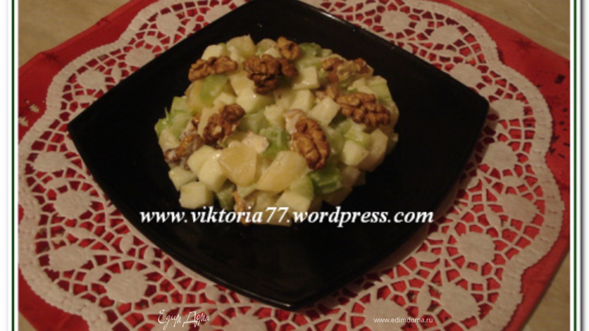 Написав предысторию этого салатика, может, я немного повеселю вас этим. В последнее время я залпом читаю книги, в основном в метро. Но вот на выходных я забыла телефон дома, а ехать просто так я не могу, поэтому решила купить какой-нибудь любовный романчик. Взгляд упал на книги Екатерины Вильмонт, книги этого автора я никогда не читала. Смешно, но я соответственно выбрала книгу «Полоса везения, или все мужики козлы». И вот главная героиня, работая переводчицей, получила поваренную книгу для перевода и выбрала рецепт салата для романтического ужина, в который входят только яблоки, сельдерей, грецкие орехи и ананас. По книге он понравился и ее поклоннику, и ей самой. И вот мне стало интересно, действительно ли такой салатик будет вкусным. Сделала себе его с утра и… Я не пожалела. Интересный и необычный вкус, свежий по-весеннему, легкий и немного бодрящий, а главное полезный! Я была ну очень довольна, спасибо любовному роману)))