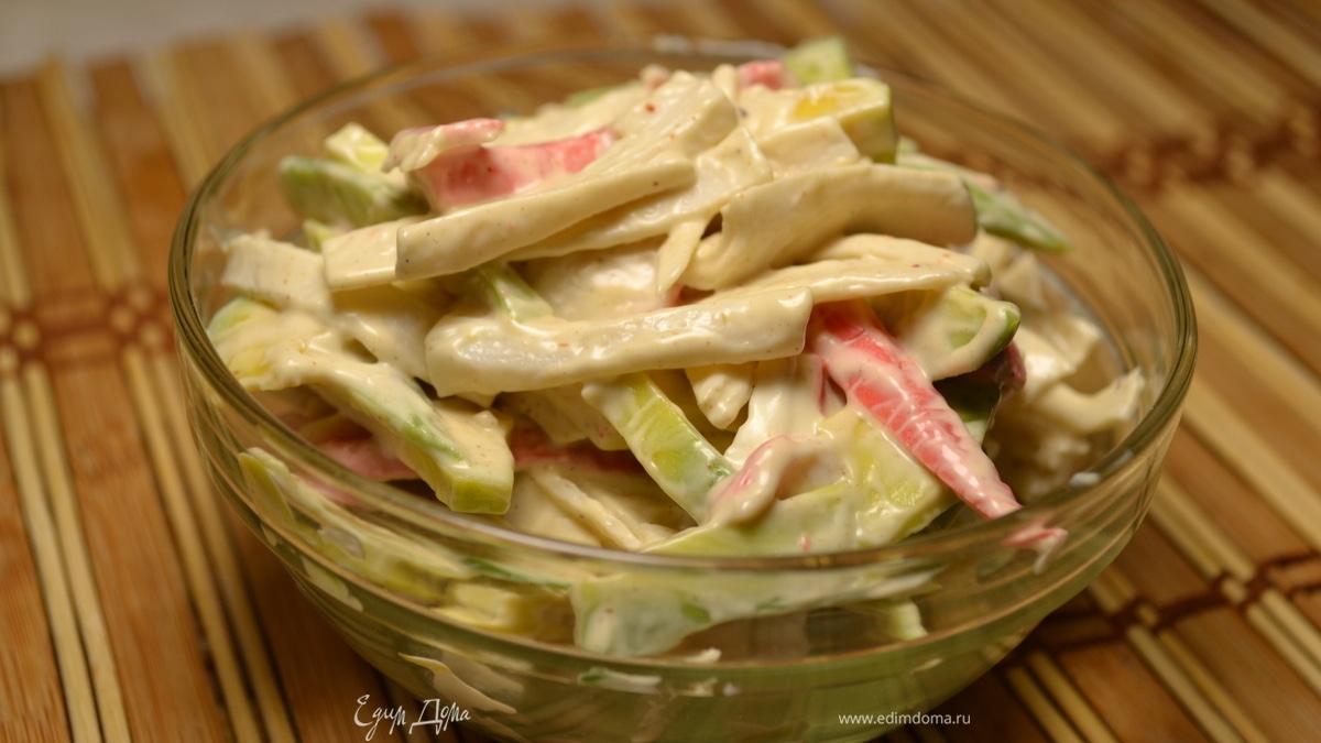 Салат с авокадо и крабовыми палочками с острым спайси соусом