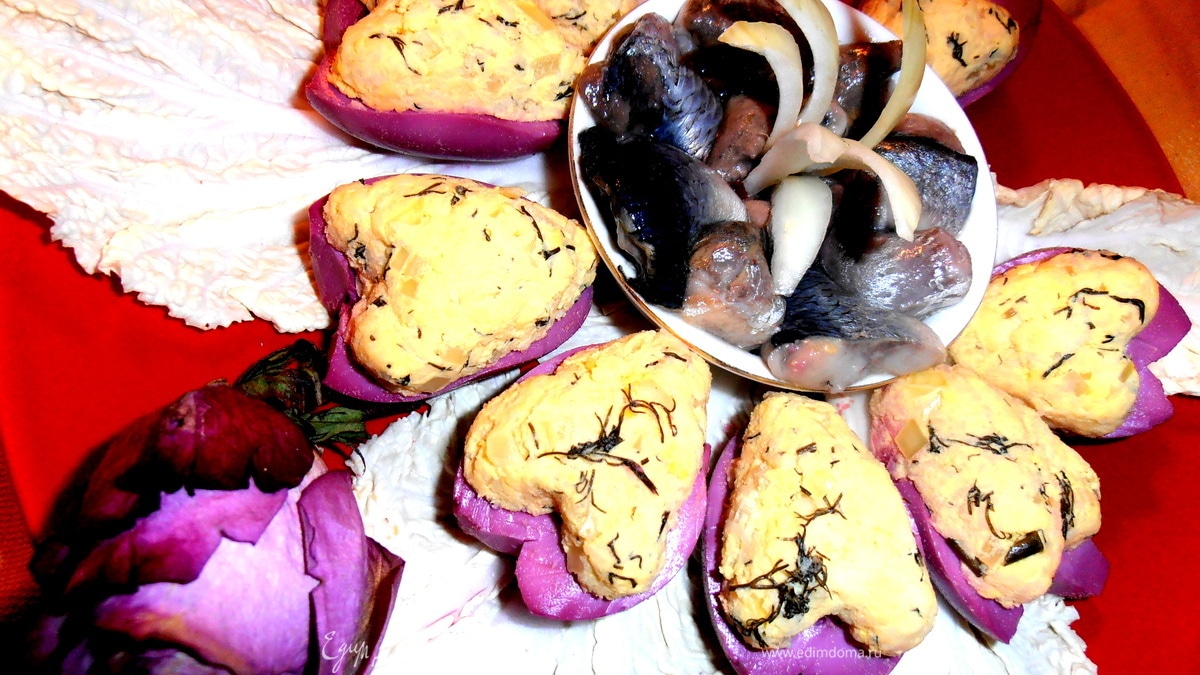 Не пора ли подумать об оформлении закуски к 14февраля?Куда ж мы без селёдочки!На самом деле рыбка любая,хоть килька м/с подойдёт...Итак,старые добрые фаршированные яйца,одетые в новый наряд по случаю праздника Всех влюблённых!))