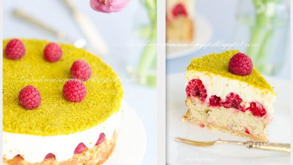 Многослойный фисташковый чизкейк с малиной