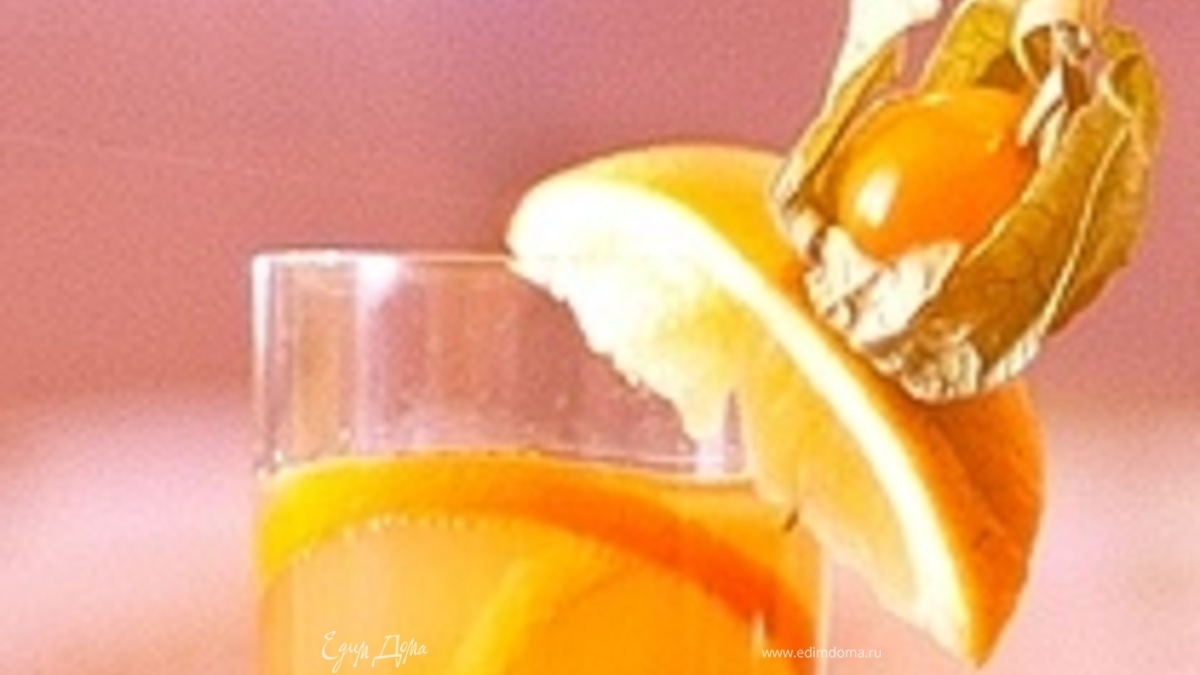 - Шаг 3Долить шампанское. Украсить долькой апельсина и физалисом на шпажке.