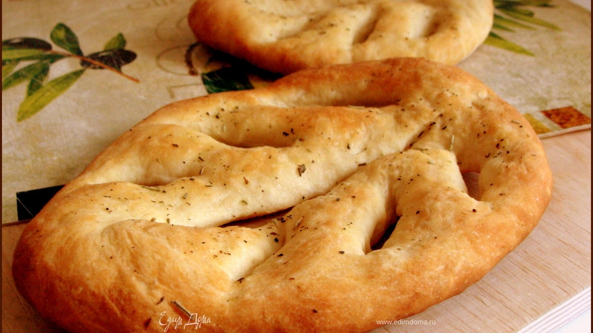 В большой миске смешать все сухие ингредиенты: дрожжи, сверху просеять муку, добавить соль и сахар. 2. Сделать колодец и влить теплую, но не горячую воду. Добавить оливковое масло и перемешать лопаткой. 3. Замесить тесто на припыленном мукой столе. В рецепте было написано добавить муки по ходу вымешивания. Но, то ли у нас разная мука, то карма разная, но мне больше не потребовалось). Тесто получилось мягким и "легким". - Шаг 1Чистую форму смазать оливковым маслом и выложить в нее тесто для расстойки. Оставить в теплом месте на 1-1,5 часа. Обмять тесто еще раз и разрезать на несколько равных кусочков. Я брала половину ингредиентов, и у меня получились три немаленькие лепешки, весом около 200 г каждая. Каждый кусочек сформировать овалом и раскатать. Разрезать вертикально по центру и сделать еще пару-тройку косых надрезов по бокам.