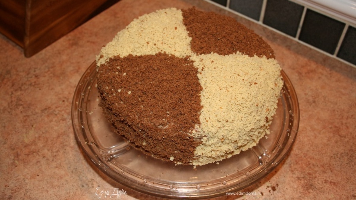 Чередуя цвета, посыпать торт крошкой. Поставить пропитываться в холодильник на, как минимум, 5 часов. - Шаг 16